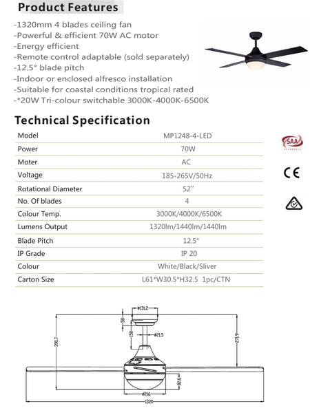 Coogee AC Ceiling Fan With LED Light - Silver 4 Blade 52"