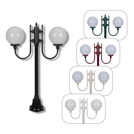 Lisbon 2 light curved arm 1.32m twin head post light, die-cast aluminium body complete with 250mm opal acrylic sphere. Made in Italy, assembled and powder coated in Australia.