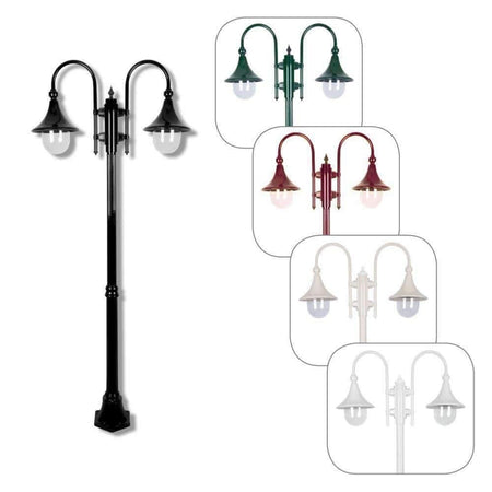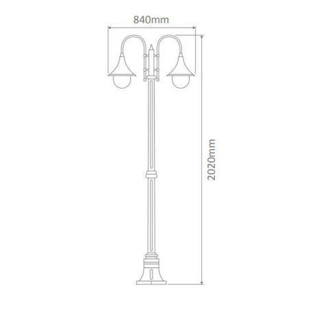 Monaco 2 light die-cast aluminium and moulded acrylic lens twin head 1.98m post light. Made in Italy, assembled and powder coated in Australia.